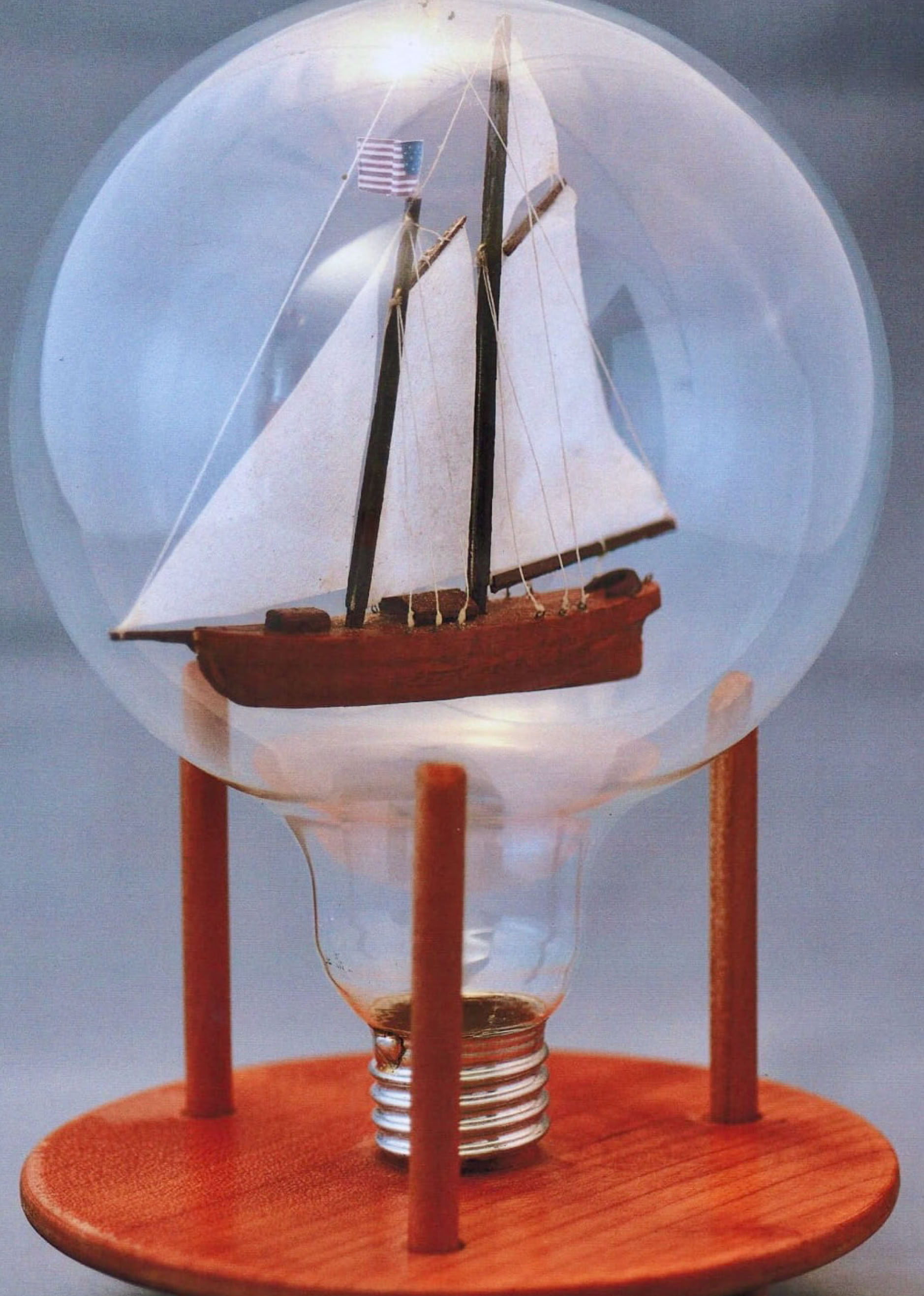 Dieses historische Modell ist erst innerhalb einer großen 1000 Watt-Lampe zusammen gebaut worden. Festhalten geht nicht, denn es wird erst nach Fertigstellung an 3 dünnen Fäden aufgehängt und schwebt förmlich in der Glaskugel.
